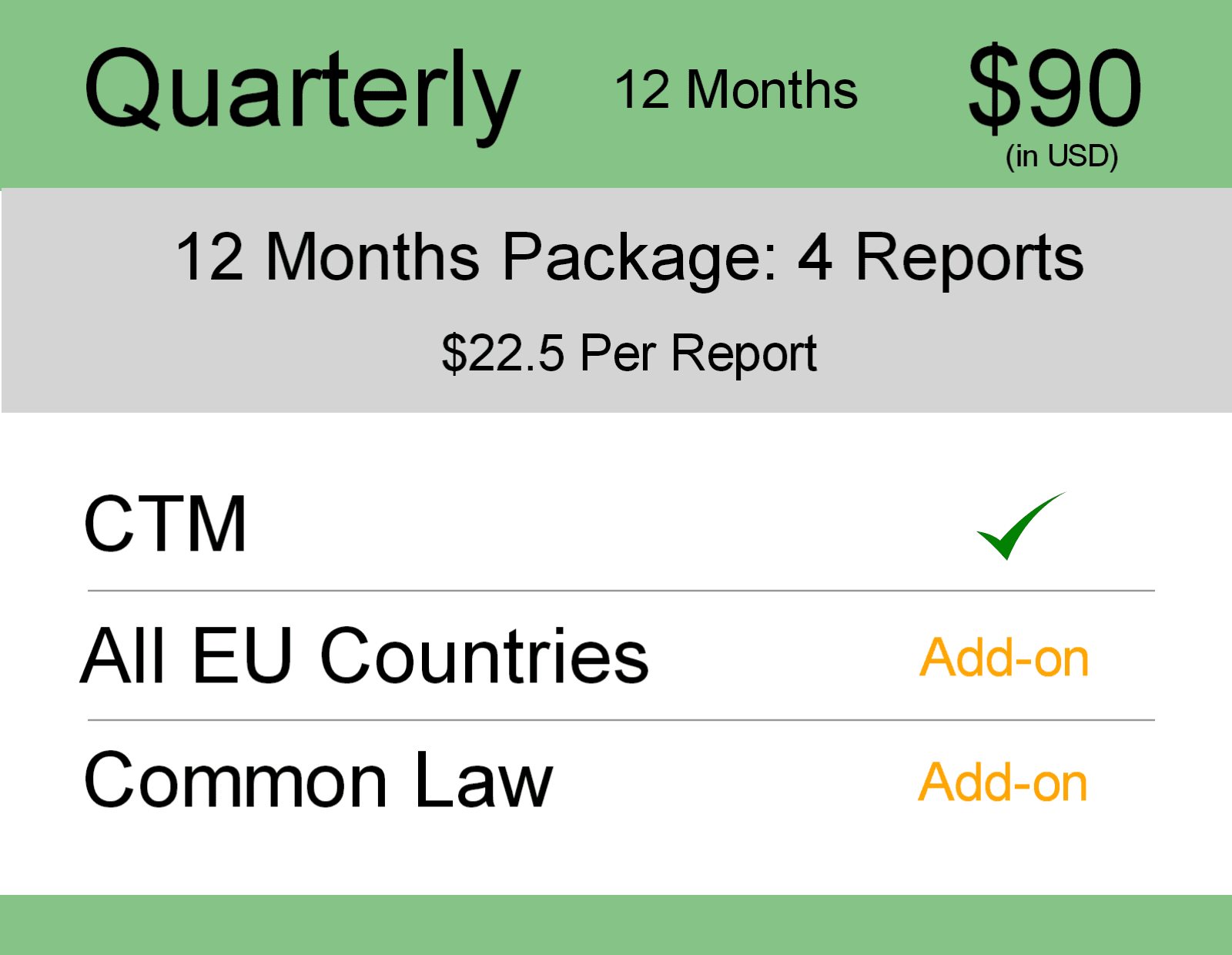 Quarterly 12 months – UK TM Monitoring Posted on August 11, 2015October 28, 2015 by admin This package includes search coverage of United Kingdom with add-ons such as CTM and Common Law.