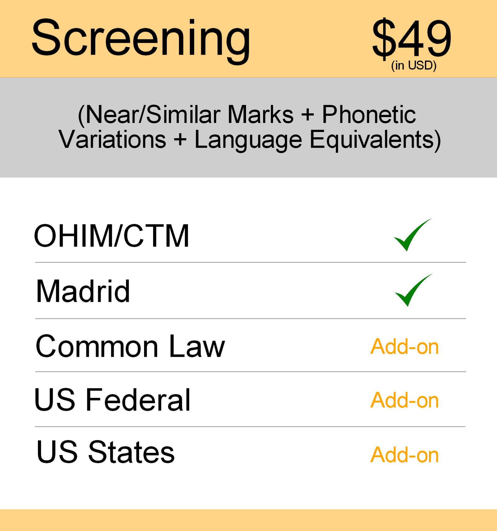 Package includes trademark searching coverage of OHIM/CTM and Madrid with add-ons such as Common Law, US Federal and US States.