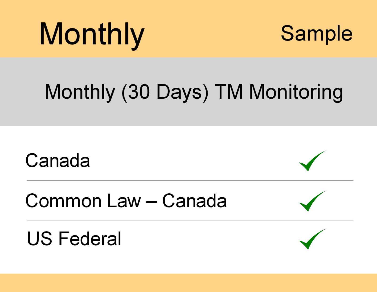 Sample Report Canada Monthly Posted on October 7, 2015October 28, 2015 by admin This sample report includes Trademark Monitoring coverage of Canada, Common Law – Canada and US Federal.